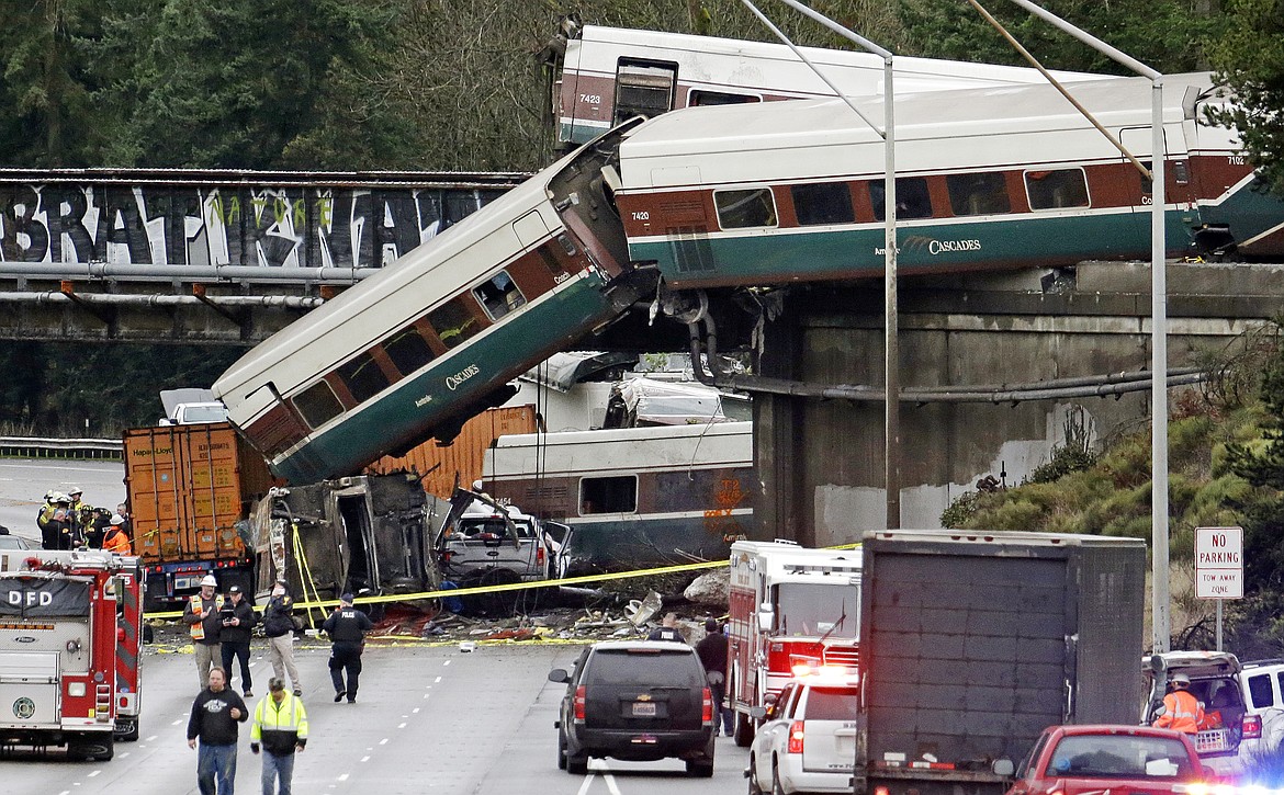 DUPONT, Wash. (AP) — An Amtrak train making the first-ever run along a faster new route hurtled off an overpass south of Seattle at an estimated 80 mph Monday and spilled some of its cars onto the highway below, killing at least six people and crushing two vehicles, authorities said.