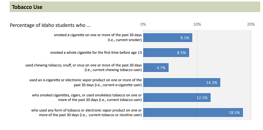The overall teen smoking rate in Idaho has declined as well since 2007, when 20 percent of teens reported smoking cigarettes within the last 30 days. This year, 9.1 percent of Idaho students reported cigarette use within the last month.