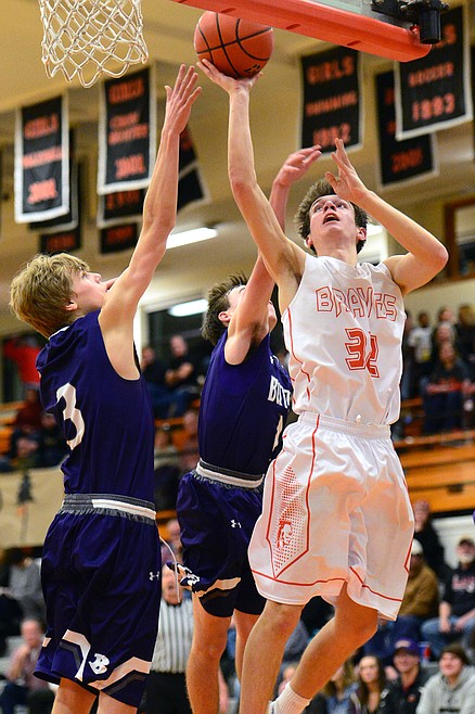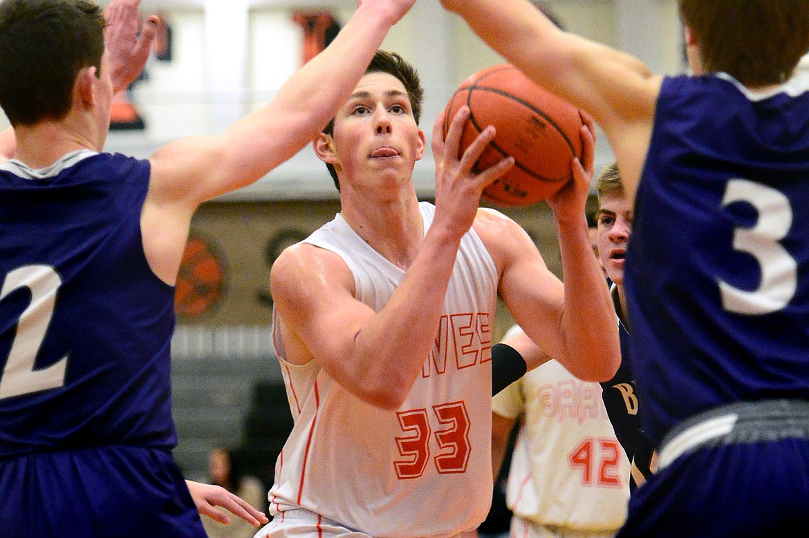 Flathead’s Andrew Siderius gets Butte defenders Trevyn Roth (14) and Clay Ferguson in the air before dropping in two points. (Casey Kreider/Daily Inter Lake)