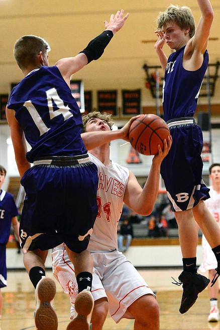 Flathead’s Sam Elliott splits Butte defenders Tommy Mellott (2) and Clay Ferguson (3) on his way to the hoop for two points. (Casey Kreider/Daily Inter Lake)