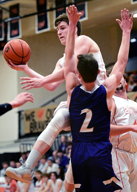 Flathead’s Tyler Johnson passes along the baseline in front of Butte defender Kale McCarthy. (Casey Kreider/Daily Inter Lake)