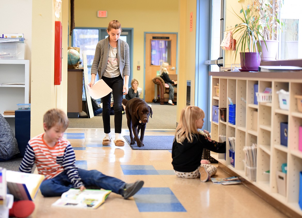 “Oftentimes she kind of knows a kid is having trouble,” Hong said. “A couple weeks ago a girl who generally never has trouble had taken a spelling test and hadn’t been happy how she had done on the spelling test, so she went into that little kitchen and she was crying. She [Sadie] went in there and she curled up at her feet. The girl worked in there all morning and she stayed there all morning with that child.”