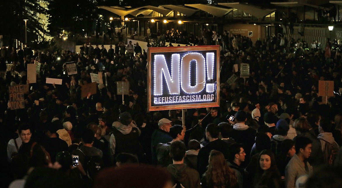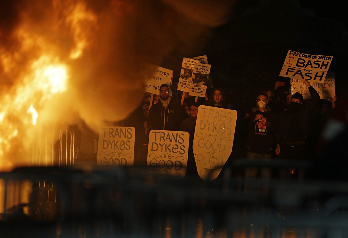 Hundreds of peaceful demonstrators carrying signs that read “Hate Speech Is Not Free Speech” had been protesting for hours before the event. A smaller group of protesters dressed in black and in hooded sweatshirts showed up as night fell and used metal barricades to break windows, threw smoke bombs and flares and set a large bonfire outside the building.