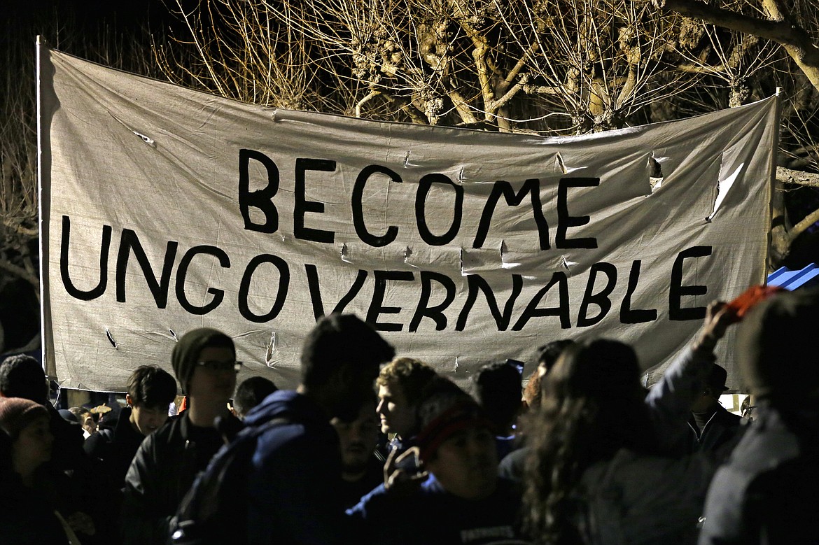 People march in front of Sproul Hall to protest the appearance of Breitbart News editor Milo Yiannopoulos on Wednesday, Feb. 1, 2017, in Berkeley, Calif. The University of California at Berkeley is bracing for major protests Wednesday against Milo Yiannopoulos, a polarizing Breitbart News editor, on the last stop of a tour aimed at defying what he calls an epidemic of political correctness on college campuses. (AP Photo/Ben Margot)
