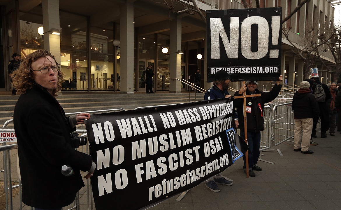 People protest the appearance of Breitbart News editor Milo Yiannopoulos on Wednesday, Feb. 1, 2017, in Berkeley, Calif. The University of California at Berkeley is bracing for major protests Wednesday against Yiannopoulos, a polarizing Breitbart News editor, on the last stop of a tour aimed at defying what he calls an epidemic of political correctness on college campuses. (AP Photo/Ben Margot)