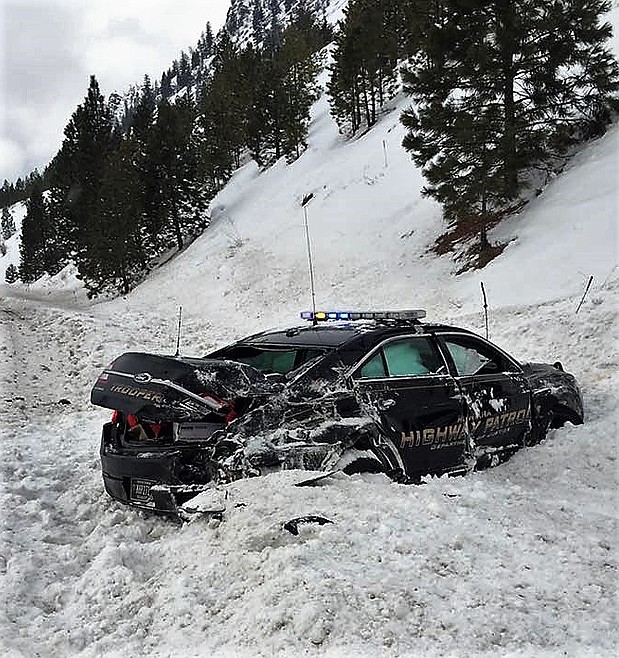 A semi-truck smashed into a highway patrol car on I-90 while the patrolman was investigating an accident. Trooper Jordon Gulick was out of his patrol car west of Alberton near mile marker 64 on Jan. 18. It was a one vehicle rollover and Gulick has parked his car in the median with his emergency lights activated.
