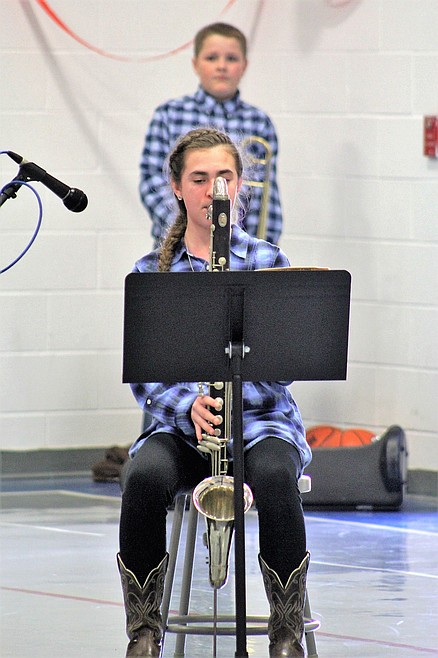 Next were the fifth graders where Jaxson Green played “Go Tell Aunt Rhodie” on the trombone followed by Lanie Crabb playing “Arabian Nights,” on the bass clarinet. Next Kodi Kelly played, “Hot Cross Buns,” on the trumpet. Allison Wood and Olivia Greuter sang, “White Boots,” followed by Lucas Kovalsky, Logan Turner, and Austin Seward dancing to “Whip and Nae-Nae.”