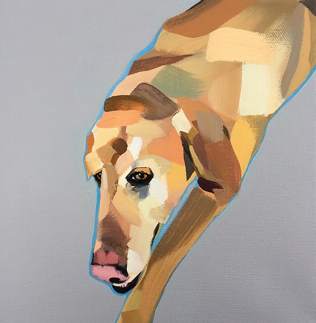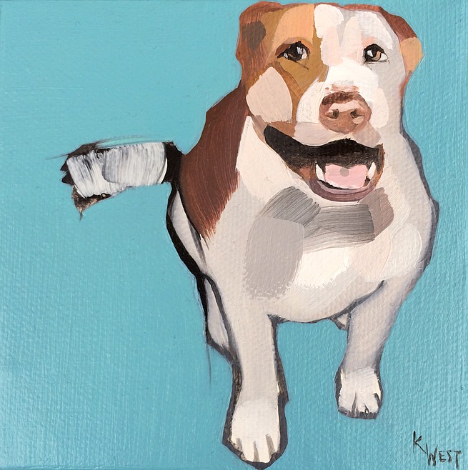 The project began with portraits of friends’ dogs, with West incorporating the impressionist style she’d been developing over the past couple years. After she’d done several portraits of different animals, including dogs, she decided to focus in on canines and make a series of the project.