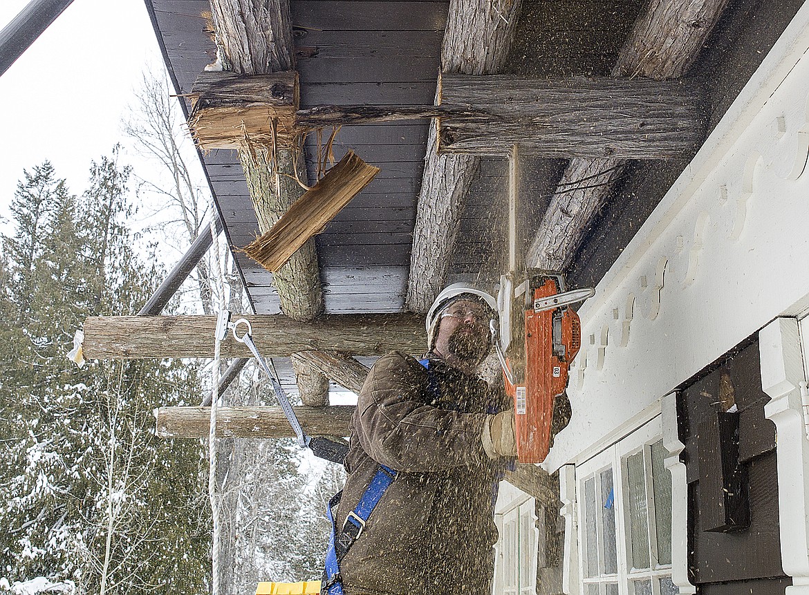 On a frigid afternoon last week as a light snow fell, Cornelius Jirod was busy carefully cutting out an old log support from the famed Lake McDonald Lodge in Glacier National Park.