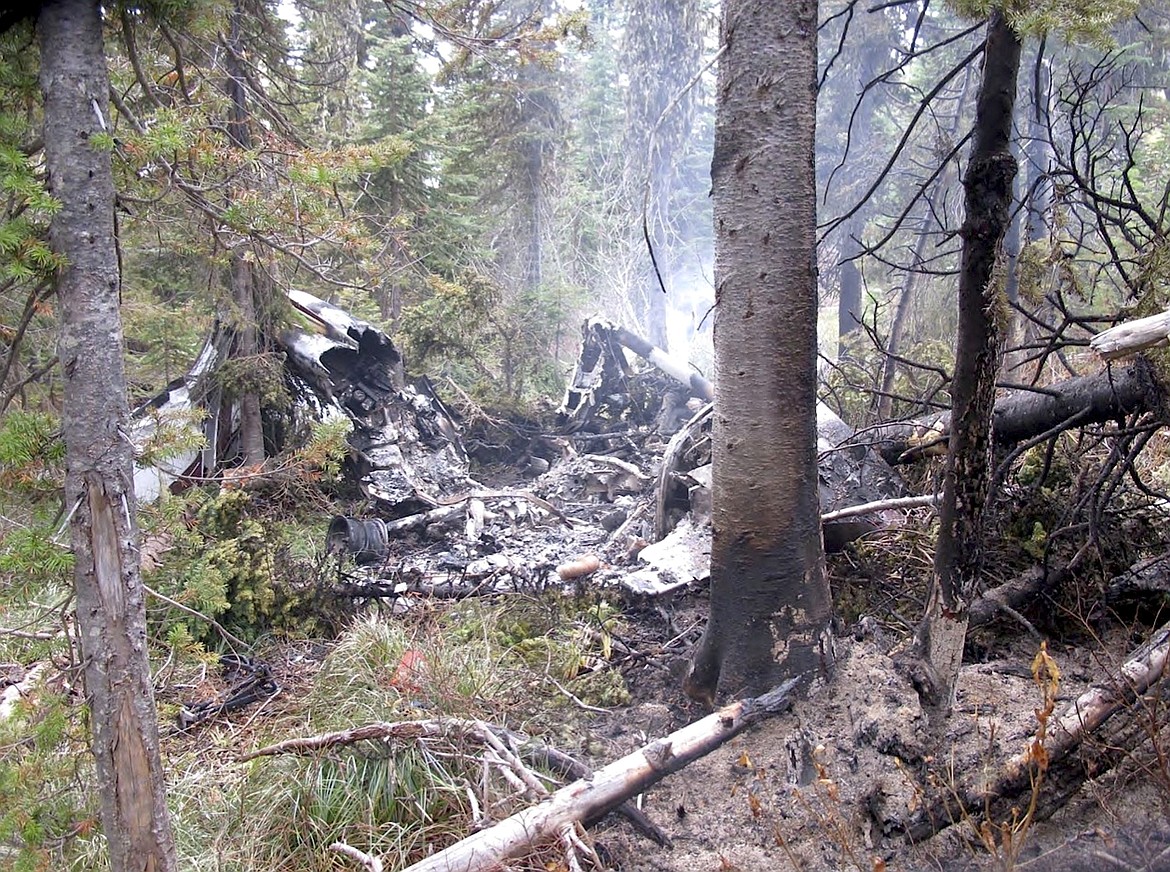 Six hours after the crash, a helicopter from Two Bear Air in Kalispell, Mont., spotted the wreckage. The still-burning wreckage was discovered just below a ridgeline saddle at an elevation of 5,226 feet above mean sea level. The plane struck numerous treetops before colliding with the shale-covered mountainside.