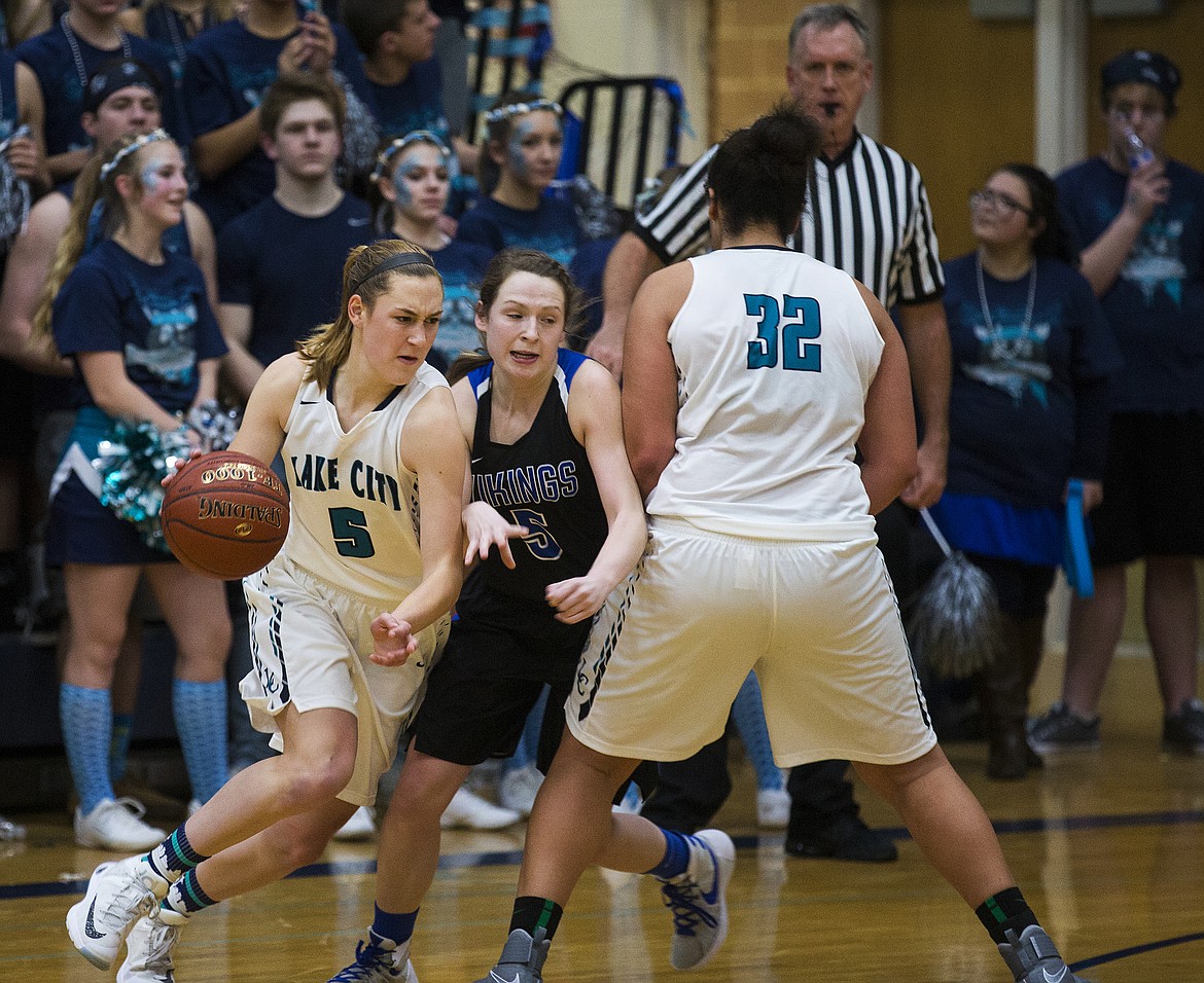 But Lake City closed the half on a 9-0 run — Rewers hit a basket, Chloe Teets scored from the right baseline, Carlson sank a 3, then fed a cutting Bridget Rieken for a layup — to lead 27-18 at the break.