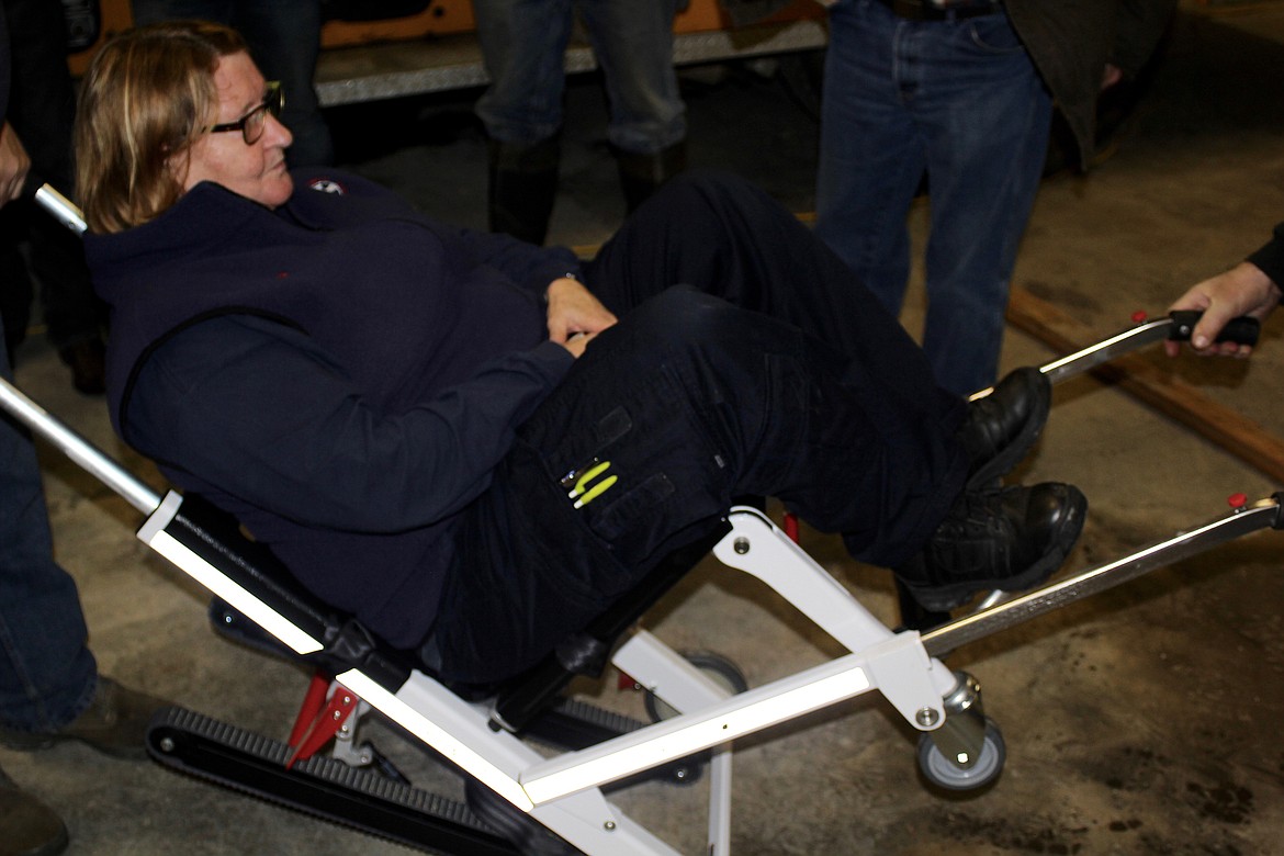 The training began after a Plains Community Ambulance with Larry Neilson returned from the lift-assist call. The emergency crews assembled into small groups of three or four and moved around to the classroom and vehicle bay inside the building. At each location there was one person giving information and a demonstration with each piece of equipment. The equipment brought out and demonstrated included new hydraulic cot, a Stair Chair, a backboard with a Back Raft and a scoop stretcher.