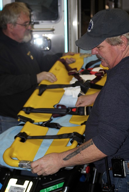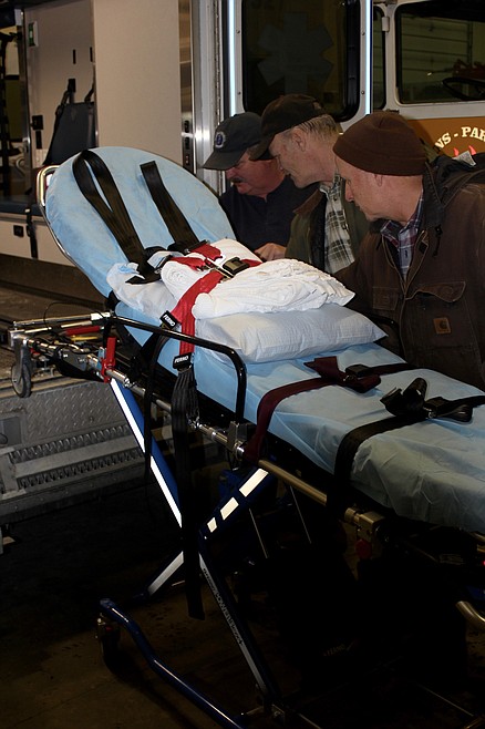The new hydraulic cot being used was purchased at a cost of $17,000 and is very sensitive to manipulate. Those attending the training were warned to be careful on where they placed hands and fingers when operating the hydraulics, as the cot can quickly move down and pinch fingers if they are improperly placed on the equipment. The cot is loaded onto a long narrow track in the ambulance and then locked into place. The track system will keep the cot from moving should the vehicle become inverted. The track system may help reduce any potential injuries to the patient, EMTs, driver and anyone else in the ambulance.
