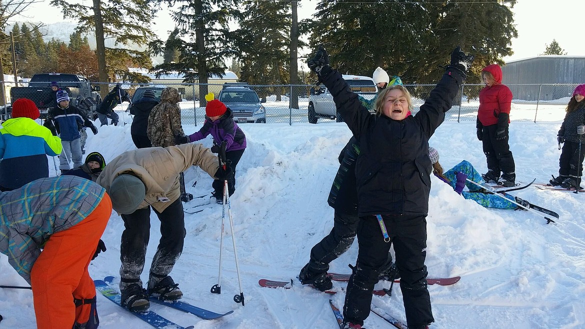 Naples students had just as much fun with the snow. Ms. Chloe Cavender took them outside and taught them to cross country ski. It was a whole school effort. The 5th graders were especially sweet, and helped the kindergarteners during their cross country ski time.