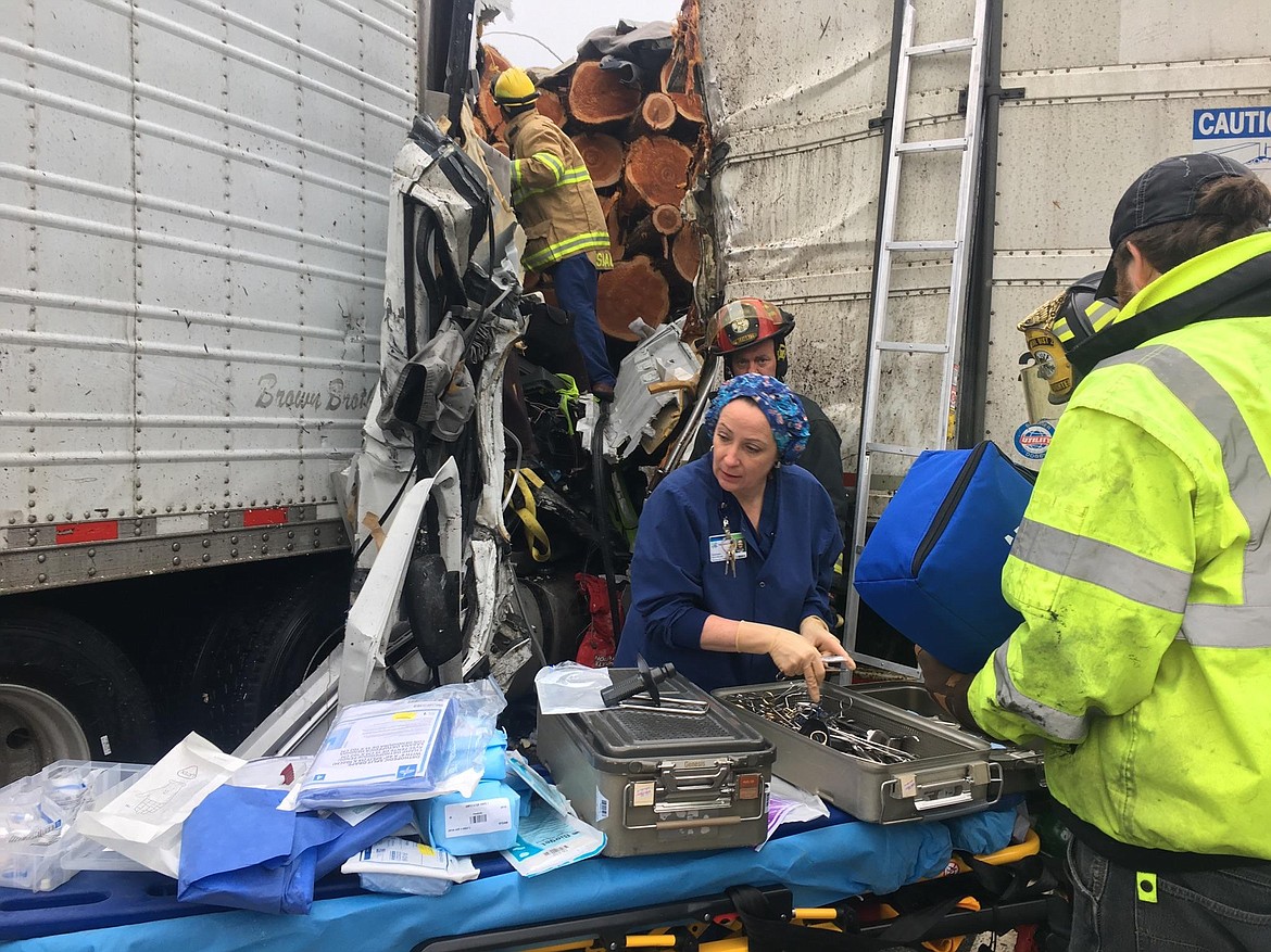 After three semis collided early in the morning, a medical team from Kootenai Health that included two trauma surgeons, a nurse and an anesthesiologist was called upon to assist first responders. They were trying to extricate a driver after logs from one of the semis lodged inside the cab and trapped the man.