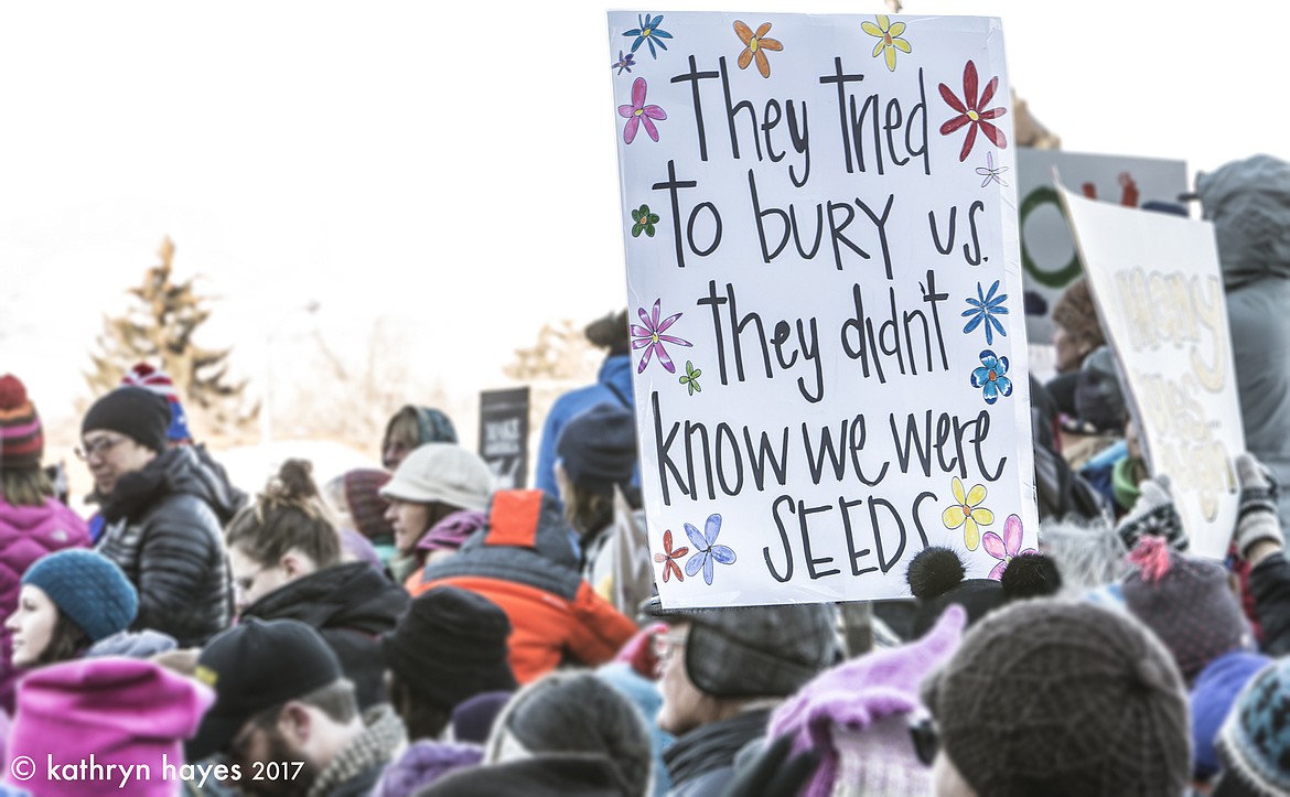 By noon, the streets were filled with supporters. Men, women, and children marched around the Capitol building holding colorful handmade signs of all shapes and sizes — signs with the sign for female power or “fight like a girl” or “respect” or “all people are equal” or “no hate.”