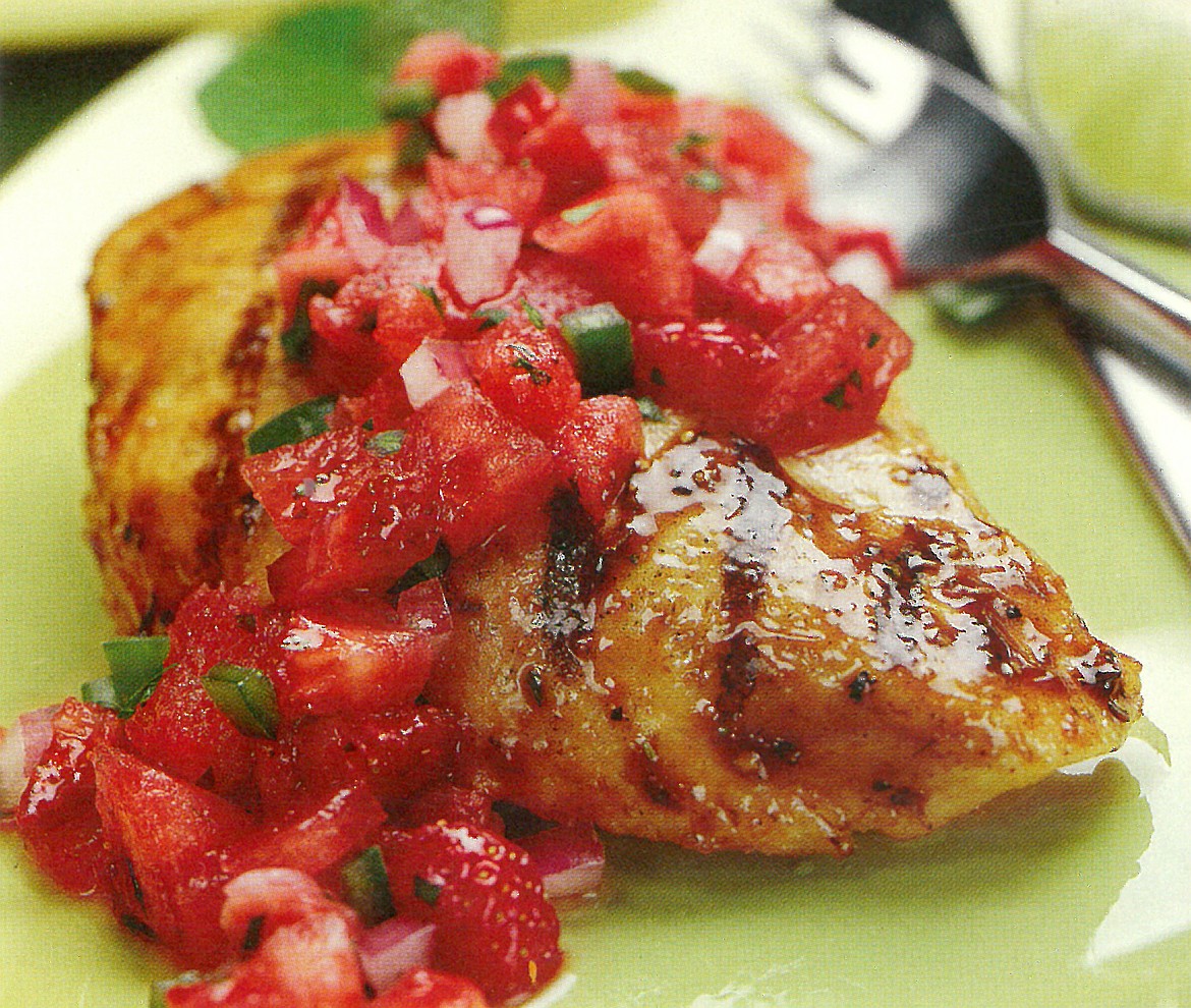Watermelon shows its wild side in this surprise salsa — perfect for topping barbecued chicken or halibut as pictured above.