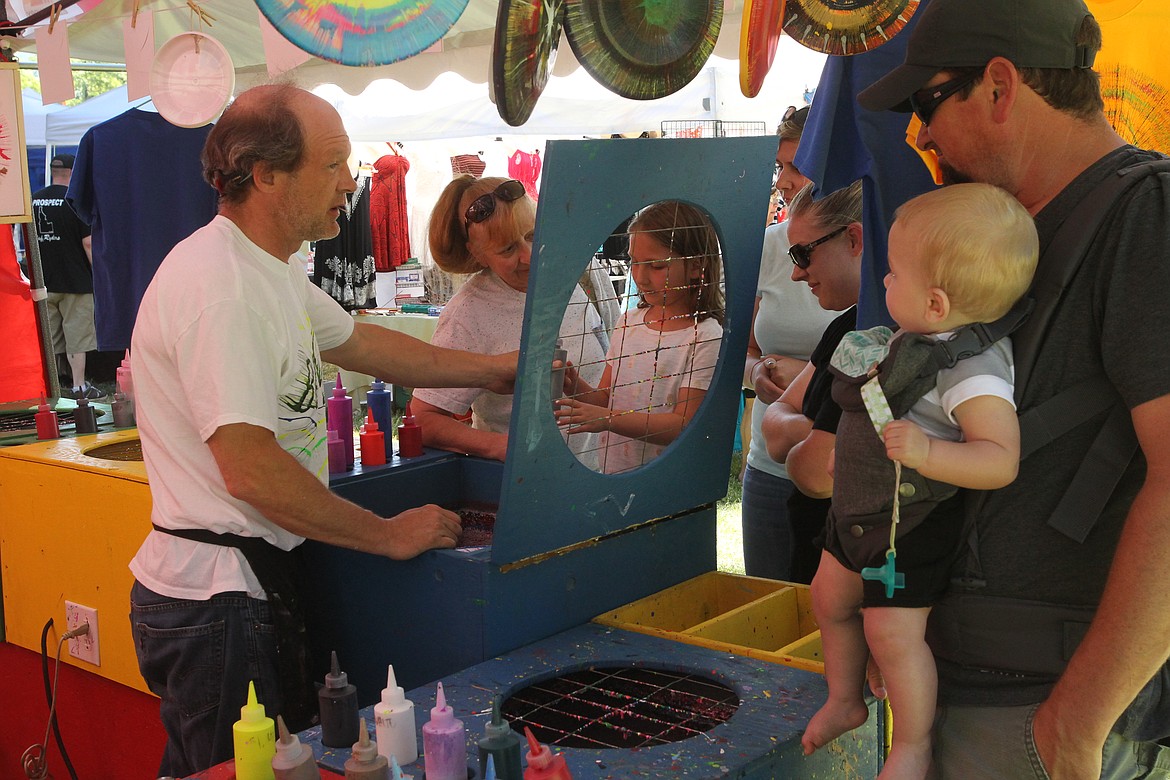 Not far away, Rick Bergstrom of Totally Spun used centrifugal force to paint unique and colorful designs on T-shirts, flying discs and souvenir cards.