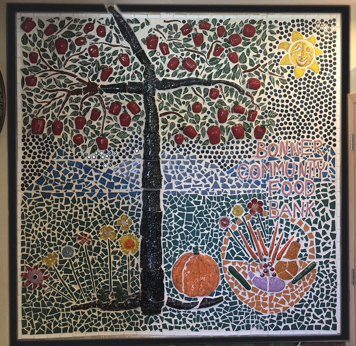 Randy Wilhelm, career-technical education instructor for LPOHS, said the students spent six or seven weeks on the mosaic. The piece includes a large apple tree, a sun, a basket of vegetables, a pumpkin, flowers, frogs, and of course, the words "Bonner Community Food Bank. Wilhelm said the entire piece likely weighs a couple hundred pounds. It was so large and heavy, Wilhelm said they had to build it in pieces at school, and then put it together on the wall in the food bank.