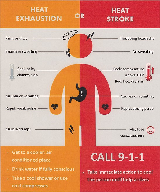 Signs of heat exhaustion include feeling faint and/or dizzy, excessive sweating, clammy skin, nausea, rapid or weak pulse and muscle cramping.