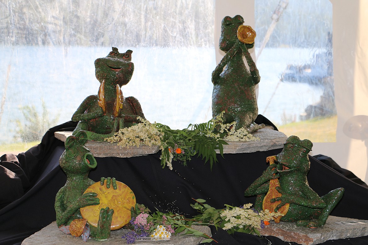 This year’s poster artist, Leata Judd, created four frog sculptures, each one playing an instrument. Their band name — The Croakers. The artwork was then photographed and used to create the posters for the Festival. The Croakers on the poster are hanging out by the river outside the Festival, having their own concert.
