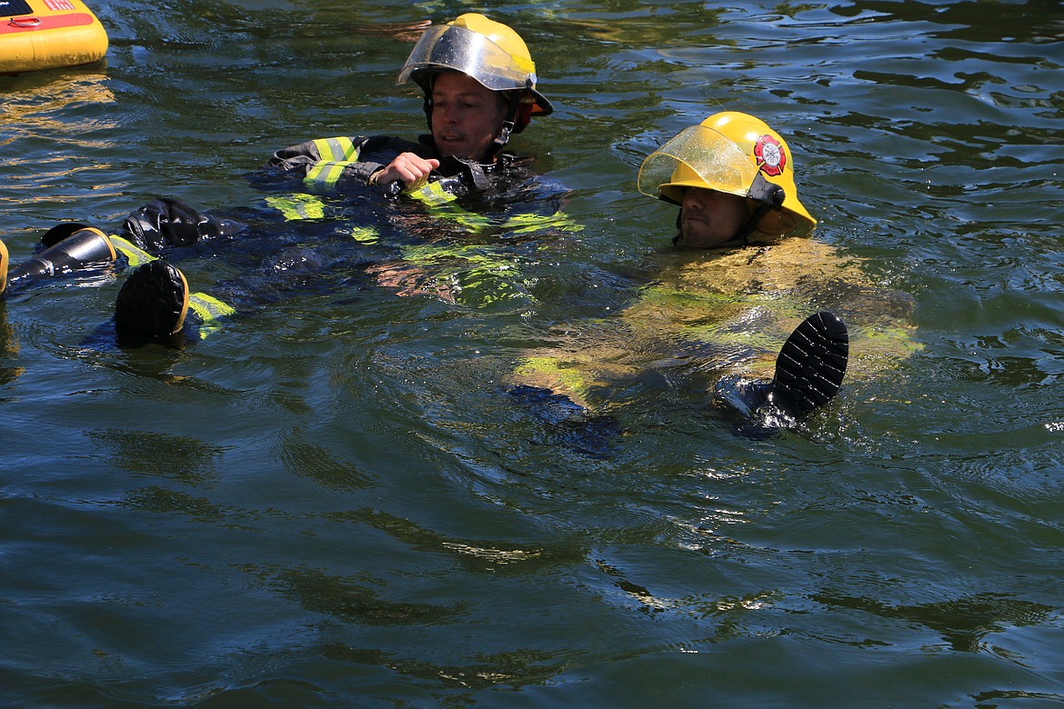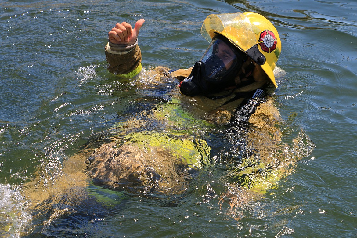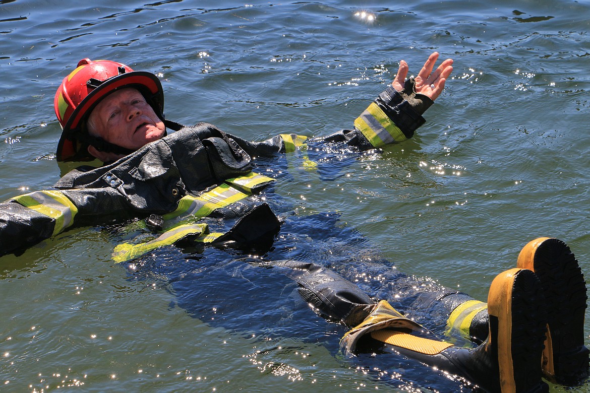 Fortunately, firefighters have some immediate buoyancy from the air trapped in the turnouts.