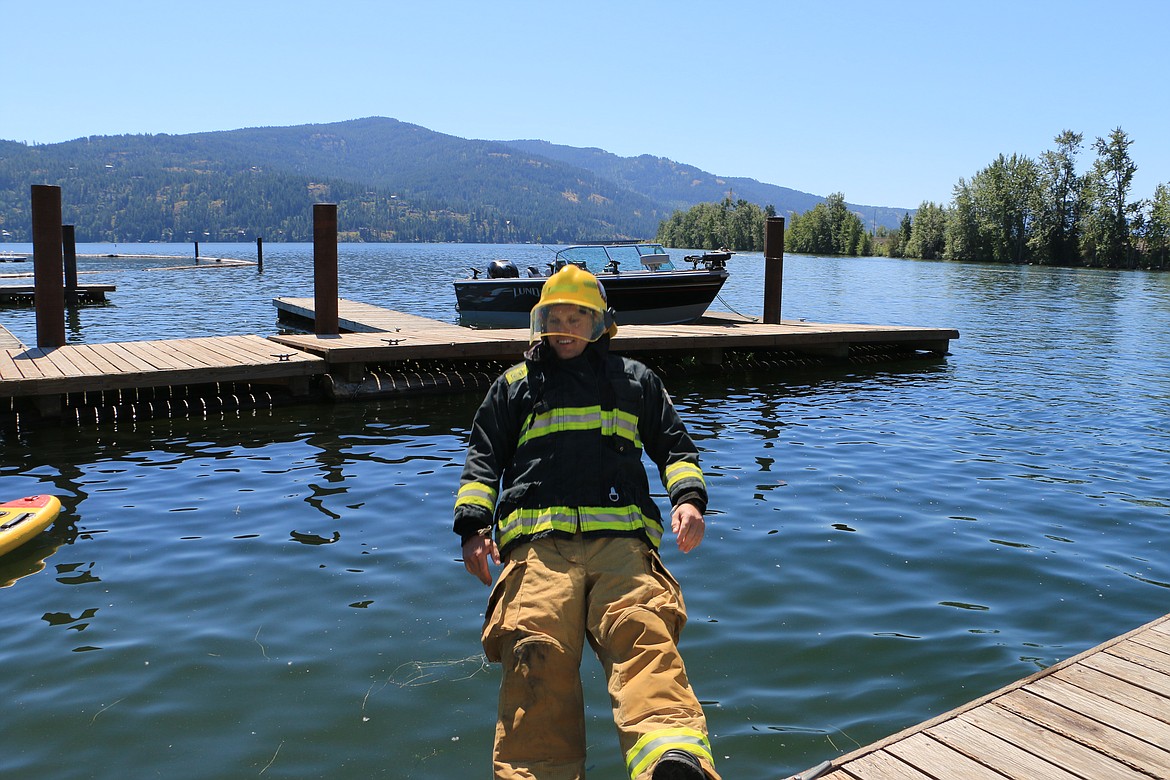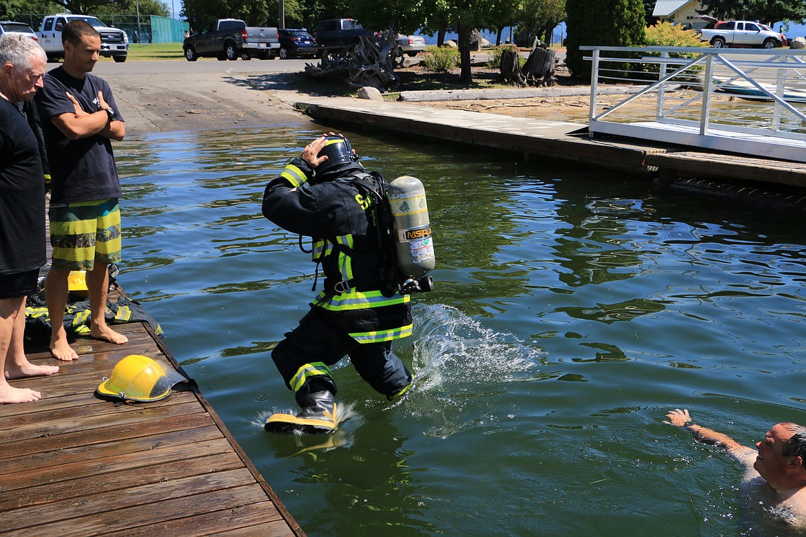 Each firefighter first went in the lake in full turnouts without an airpack, staying afloat as long as possible. Then they each went in with an airpack. Because the turnouts lose buoyancy after a few minutes, they also had to remove the gear while in the water — they were all wearing swim shorts as well, though they probably would not have that luxury in an emergency situation.