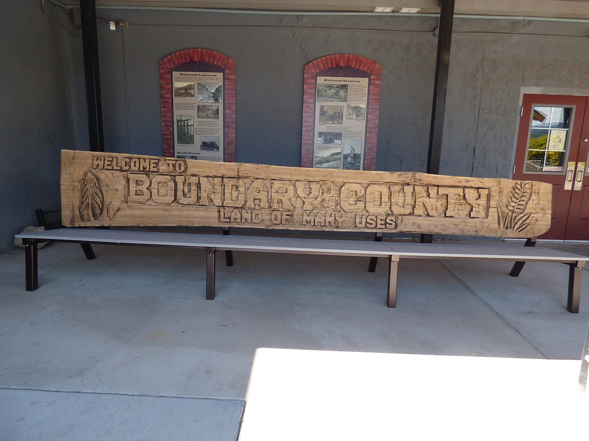 Finally, in June 2017, with funding available, The Boundary County Historical Society commissioned North Idaho Ironworks to construct benches using the two cedar slabs. The beautifully carved wood pieces again “Welcome” visitors to Boundary County, and provide a place to rest while in the Museum Railroad Courtyard.