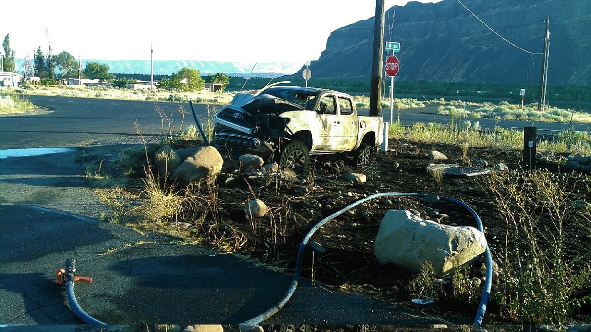 About 6 p.m. firefighters responded to a report of a brush fire in the area of state Route 243 and B Street, next to a gas station in Schwana. A witness reported seeing a pickup truck crash and a man run away from the scene, according to the Grant County Sheriff’s Office.