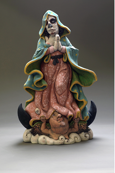 Done in the style of the Day of the Dead, a Mexican holiday when people remember loved ones who have died, the sculpture offers a corpse-like presentation of Our Lady of Guadalupe. Her face is skull-like with the lips that appear to be sewn shut, although it is the way teeth are detailed in Day of the Dead style.
