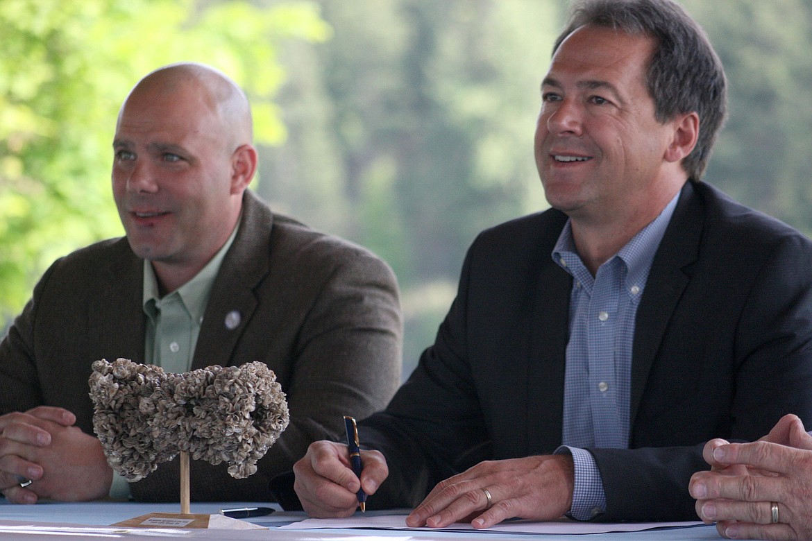 Gov. Steve Bullock, Sen. Chas Vincent, R-Libby, and Rep. Mike Cuffe, R-Eureka, met in Riverfront Park in Libby on Tuesday for a ceremonial signing of two bills — Senate Bill 363 (proposed by Vincent) and House Bill 622 — aimed at protecting Montana waterways from invasive species.