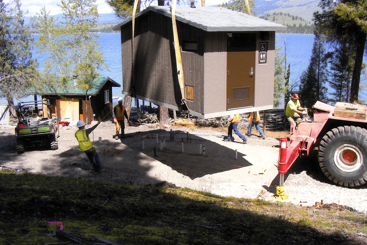 Over the past few weeks, workers aboard the Dayton-based barge S.S. Hodge have shuttled multiple bathroom and shower units across Big Arm Bay for installation onto the 64-acre island.