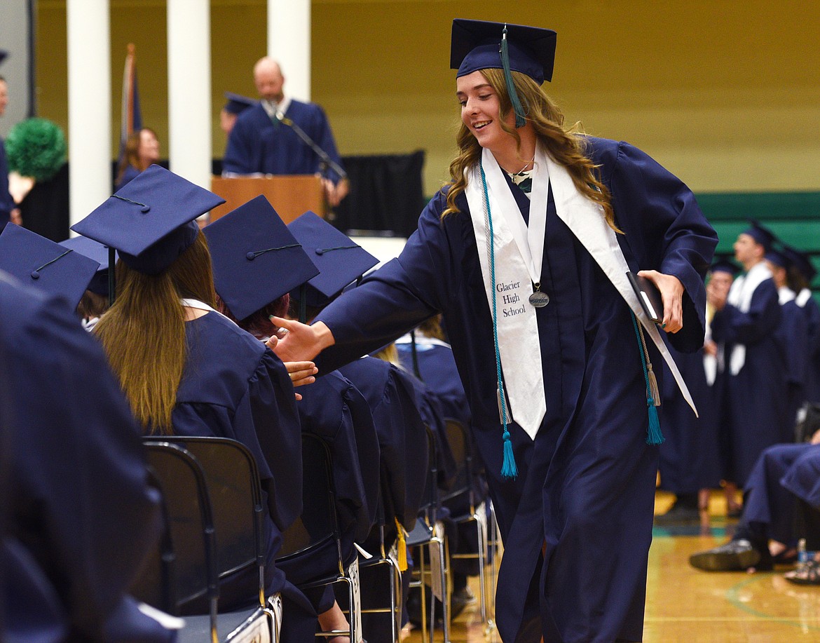 Glacier High School students clad in dark blue caps and gowns entered the school gym as high school seniors and left as graduates at the school’s ninth commencement ceremony on Saturday.