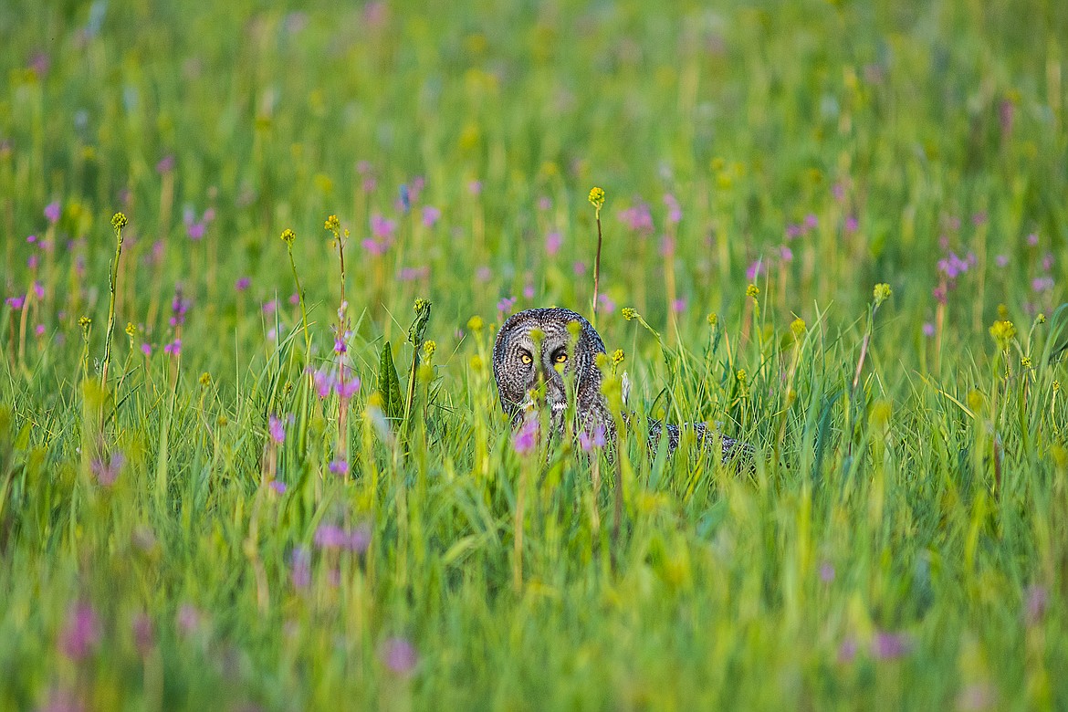 Great grays have phenomenal hearing and even when hunting in daylight, they use their ears.