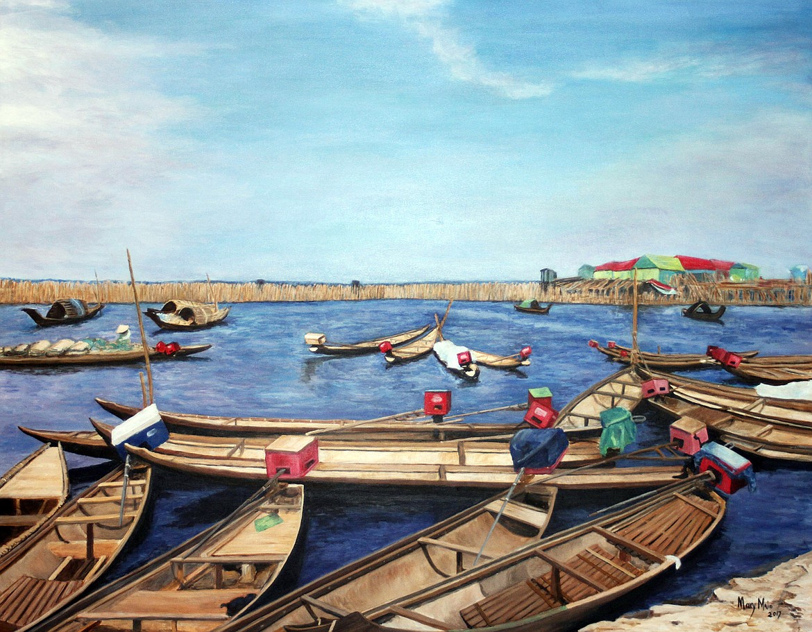 In the beginning, Maio delved deeply into each photograph searching for a unique story with the intent to transmit its narrative with a strong sense of realism. Next, Maio set out to paint what her thoughts, hand, and heart would express by engendering each brushstroke with a spirit of “life movement.” The showcase piece, “Docking for the Bamboo City,” depicts the hot, midday sun beating down on the docked flat boats gently rocking on the water ready to carry passengers to the restaurants precipitously poised over the bay on bamboo poles and zip ties.
