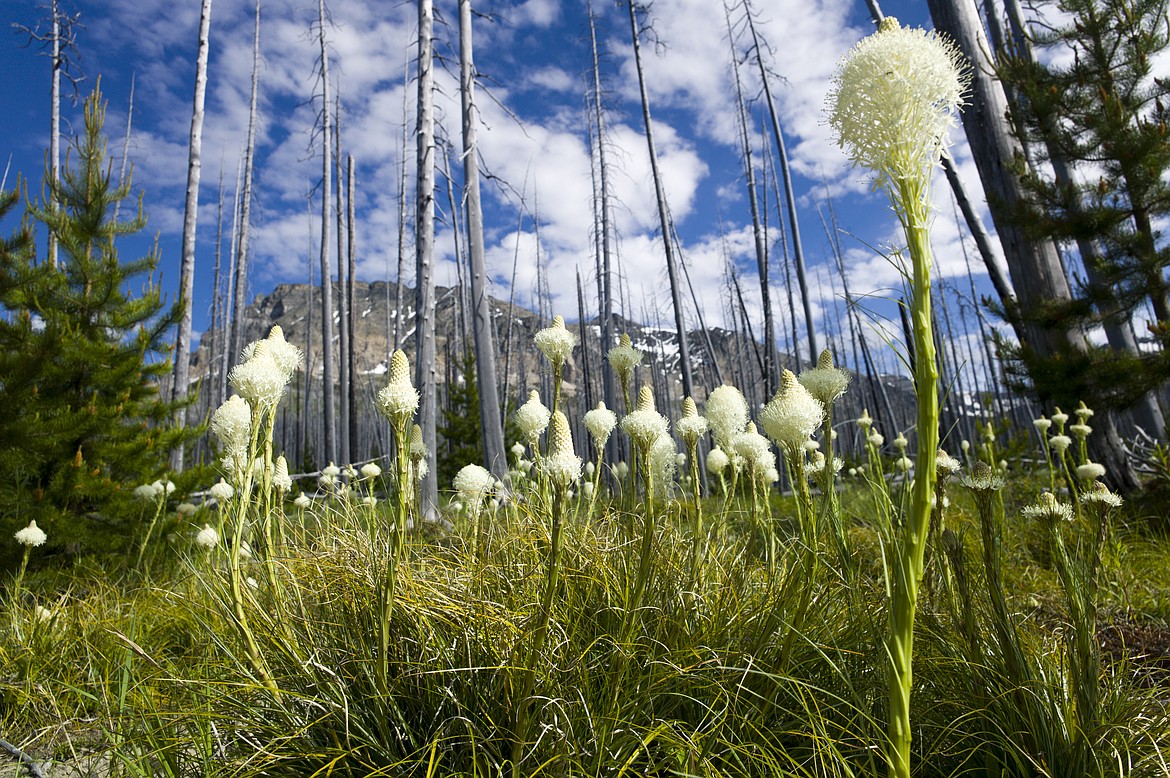 Bear grass grows from the valley floor to the alpine terrain in Glacier, blooming as the snow recedes each spring. Each flower head is made up of hundreds of individual white flowers.