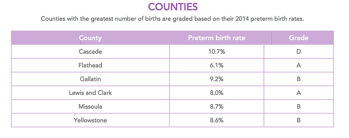 Flathead County had the lowest premature birth rate out of Montana’s six largest counties, according to the 2016 March of Dimes Report Card. The county had a rate of 6.1 percent. Cascade County had the highest rate at 10.7 percent.