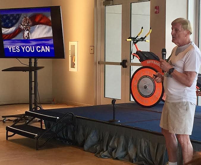 With sailboats gently gliding across Lake Coeur d'Alene as a backdrop outside the Event Center windows, Dick shared videos and a photo slideshow of Rick growing up like a normal child, despite his challenges.