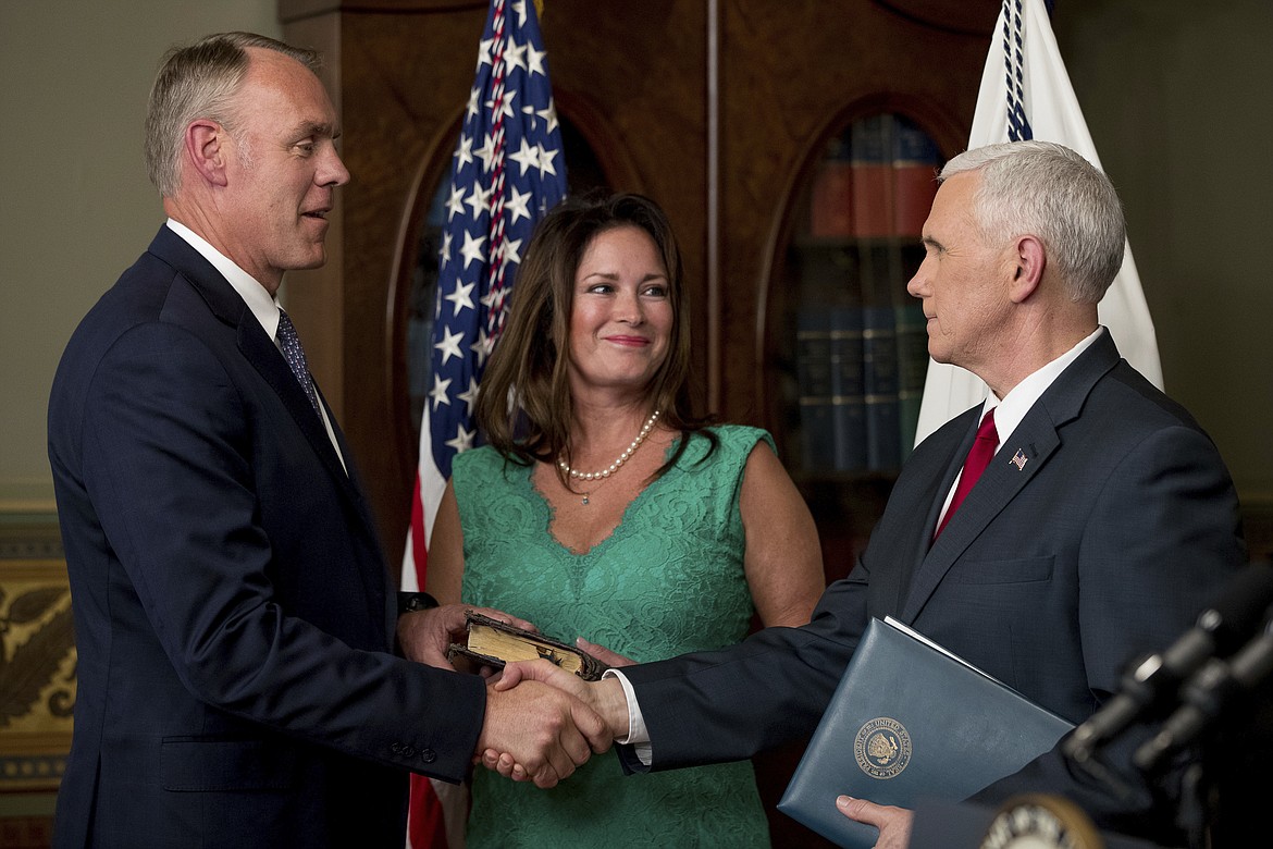 Vice President Mike Pence, right, shakes hands after administering the oath of office to Interior Secretary Ryan Zinke, left, Wednesday, March 1, 2017, in the Eisenhower Executive Office Building on the White House complex in Washington. Also pictured is Ryan Zinke's wife Lolita Hand, center. (AP Photo/Andrew Harnik)