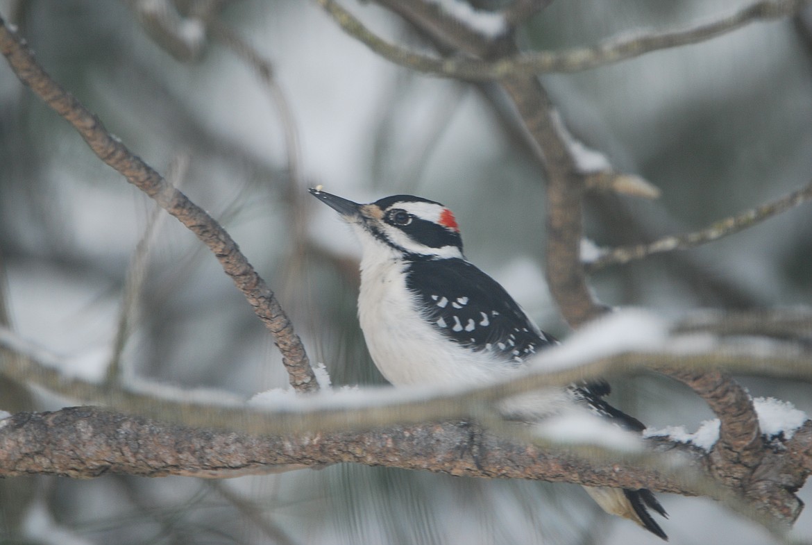 During the winter I had noticed on several occasions a small to medium size bird foraging mainly on the trunks and limbs of trees and sometimes on shrubs. It was an energetic bird in his search, often probing, scaling off bark, and excavating into dead wood in pursuit of insects. The bird had a fairly square head, a long, straight, chisel-like bill, and stiff, long tail feathers to lean against on tree trunks. His bill was nearly the same length as his head. The bird was entertaining as he would hitch up tree trunks and along main branches in search of his food. He would sometimes feed at the base of trees, along fallen logs, and even on the ground and particularly at the bird feeder. He had a slowly undulating flight pattern like most woodpeckers.