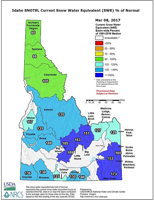 February precipitation was much above average in the Panhandle, ranging from 179 percent of normal in the Coeur d'Alene River drainage to 250 percent in the Rathdrum Creek watershed, according to the NRCS. The precipitation brought North Idaho closer to other areas of the state.