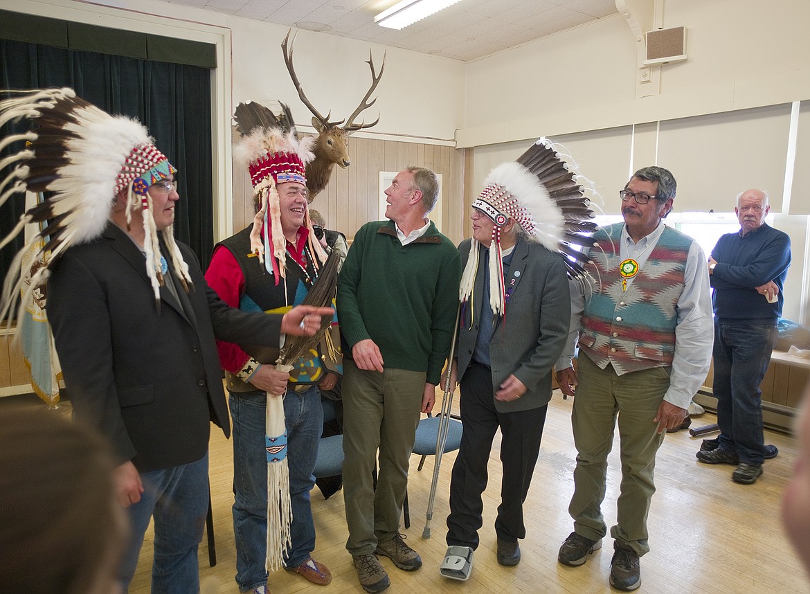 The visit began with a prayer ceremony by Blackfeet tribal leaders as Tyson Running Wolf blessed Zinke and his wife, Lola and son, Wolf.