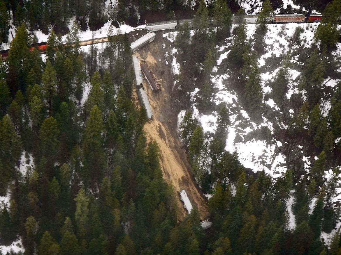 “Photos show the train was crossing the slide area and the vibration of the train caused that area to let go,” said Boundary County Public Information Officer Michael Meier. “The engine and several cars were past the slide area, but four railcars with grain slid down the hill close to the river, an additional six to eight cars were on their side within the rail line area.”