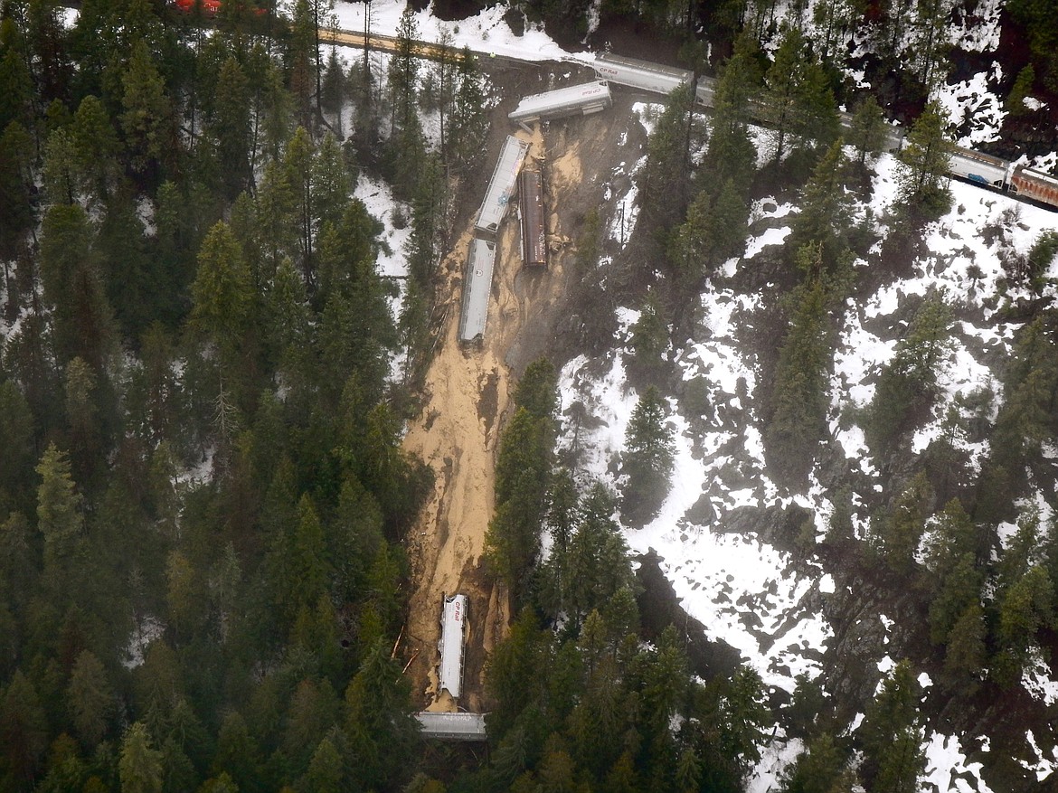 “Photos show the train was crossing the slide area and the vibration of the train caused that area to let go,” said Boundary County Public Information Officer Michael Meier. “The engine and several cars were past the slide area, but four railcars with grain slid down the hill close to the river, an additional six to eight cars were on their side within the rail line area.”