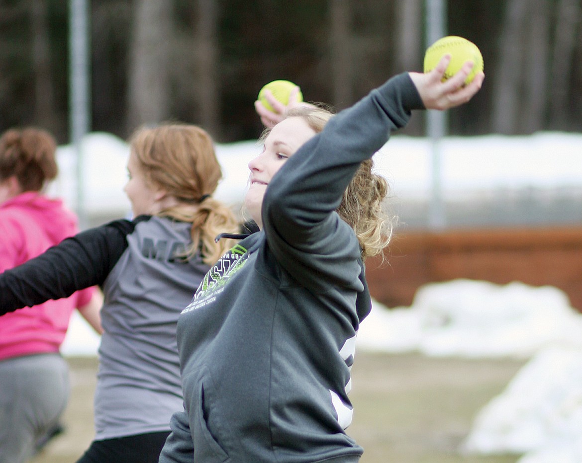 Due to high snowfall this year, the Trojan softball team have started their spring practice on the field behind the elementary instead of their home field at Roosevelt park until the field is clear of snow. Inside a half moon of mounded up snow from a recent plowing, the team is immersed in catching drills.