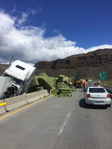 About 11:55 a.m. Regan Calaway, 19, of Mattawa, was driving a 2002 Freightliner tractor and trailer west on Interstate 90, about one mile east of Vantage, when he entered the curve at a high rate of speed just before the bridge. The trailer overturned, spilling hay bales into the eastbound and westbound lanes of I-90. A Ford F-150 pickup truck driven by Dylan Romine, 23, of Cody, Wyo., then collided with a hale bale in the eastbound lane.