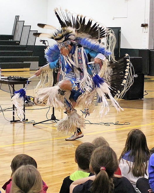He is from Montana’s Crow Reservation and was dressed in a full Native American costume used for “fancy dances.” Complete with a headdress made up of eagle feathers and intricate beadwork on his head and arm bands. Bright blue and white feathers lined his arms and long tassels dangled from his arms, legs and shoulders. He wore beaded leather moccasins and carried sticks with feathers which flew and bounced as he danced to an ancient Native American beat.