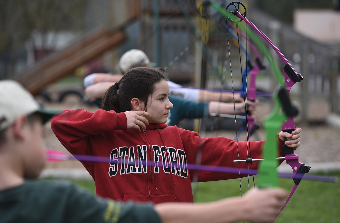 Pulling the drawstring back into a fixed position, seventh-grader Ila Stevens lined her sight on the target. Her partner, seventh-grader Kaeton Larson, shouted encouragement.