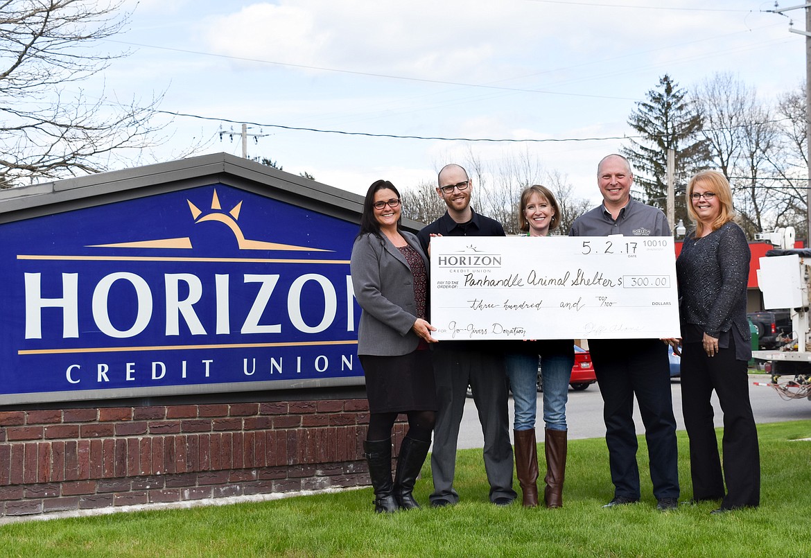 The checks were presented at the Horizon Credit Union branch in Sandpoint on Tuesday, May 2. Debbie Love and Barb Oler were present to accept the donation on behalf of Bonner Community Food Bank while Mandy Evans accepted the check on behalf of the Panhandle Animal Shelter.