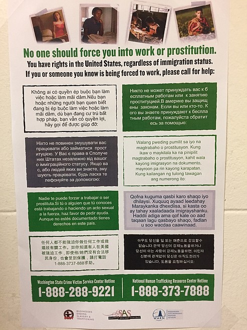 The message is repeated in eight different languages: Vietnamese, Ukrainian, Spanish, Chinese, Russian, Tagalog, Somali, and Korean. And two phone numbers on the bottom — one for the Washington state Crime Victim Service Center, and another for the National Human Trafficking Resource Center.